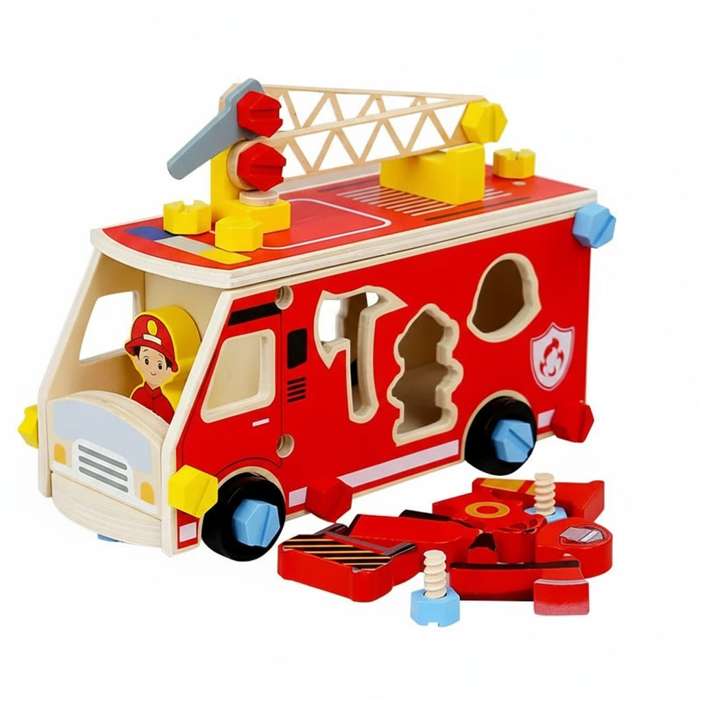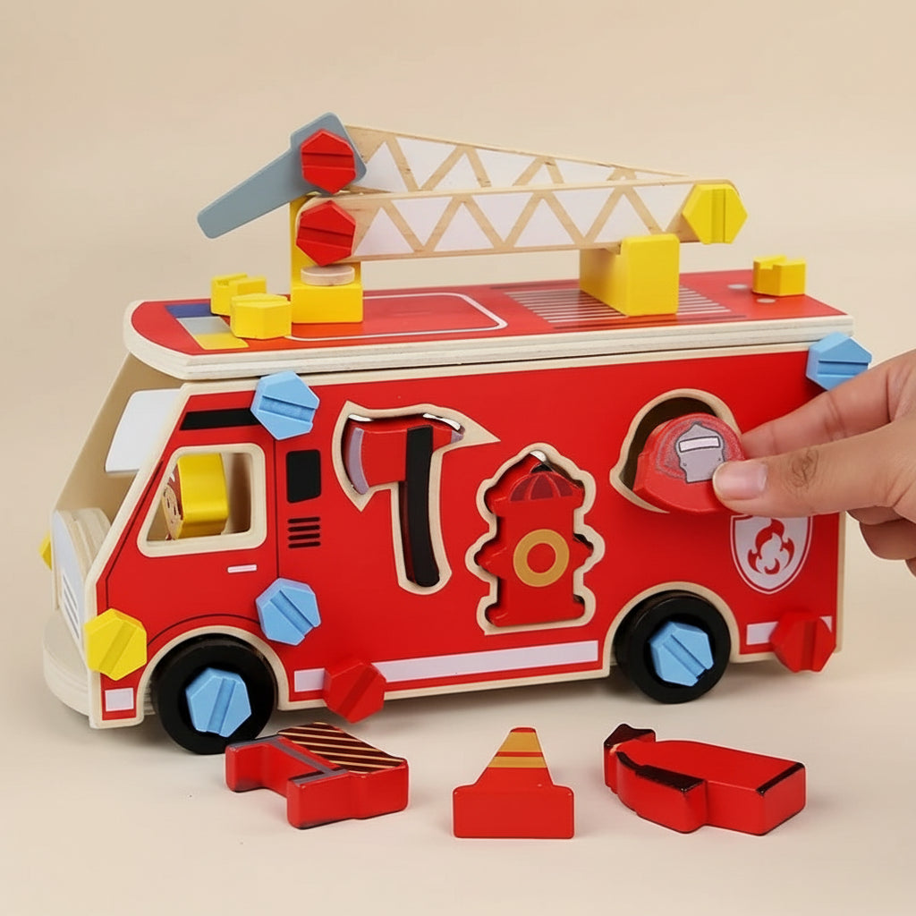 This multifunctional toy combines imaginative play with hands-on learning featuring shape-sorting cutouts, removable rescue accessories, and a friendly wooden firefighter ready for action.